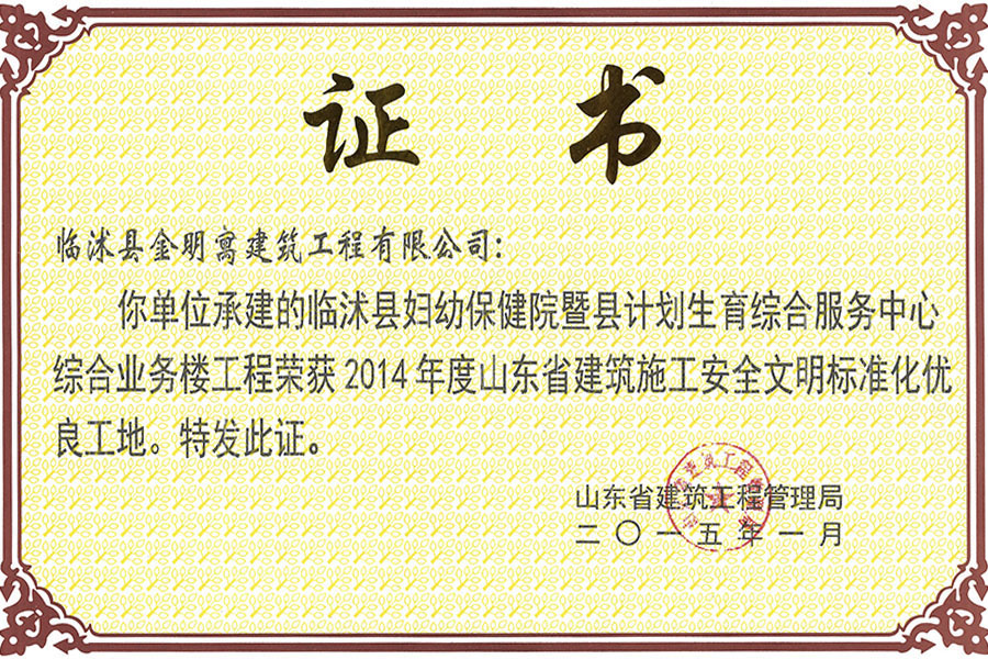 承建臨沭縣婦幼保健院和縣計劃生育綜合服務中心綜合業(yè)務樓工程榮獲2014年度山東省建筑施工安全文明標準化優(yōu)良工地