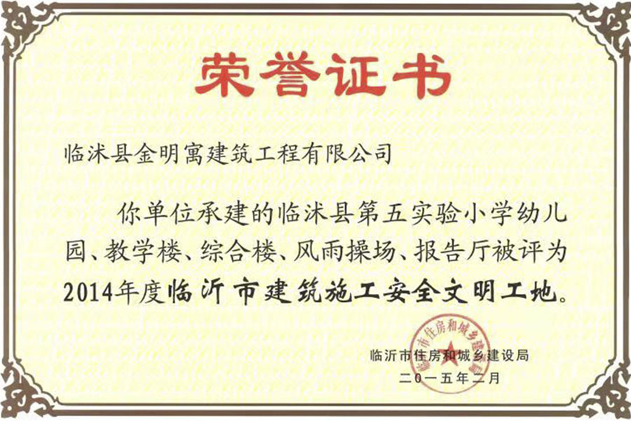 承建臨沭縣第五實(shí)驗(yàn)小學(xué)幼兒園、教學(xué)樓、綜合樓、風(fēng)雨操場、報(bào)告廳榮獲2014年度臨沂市建筑施工安全文明工地