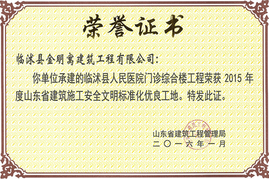 承建臨沭縣人民醫(yī)院門診綜合樓工程榮獲2015年度山東省建筑施工安全文明標(biāo)準(zhǔn)化優(yōu)良工地